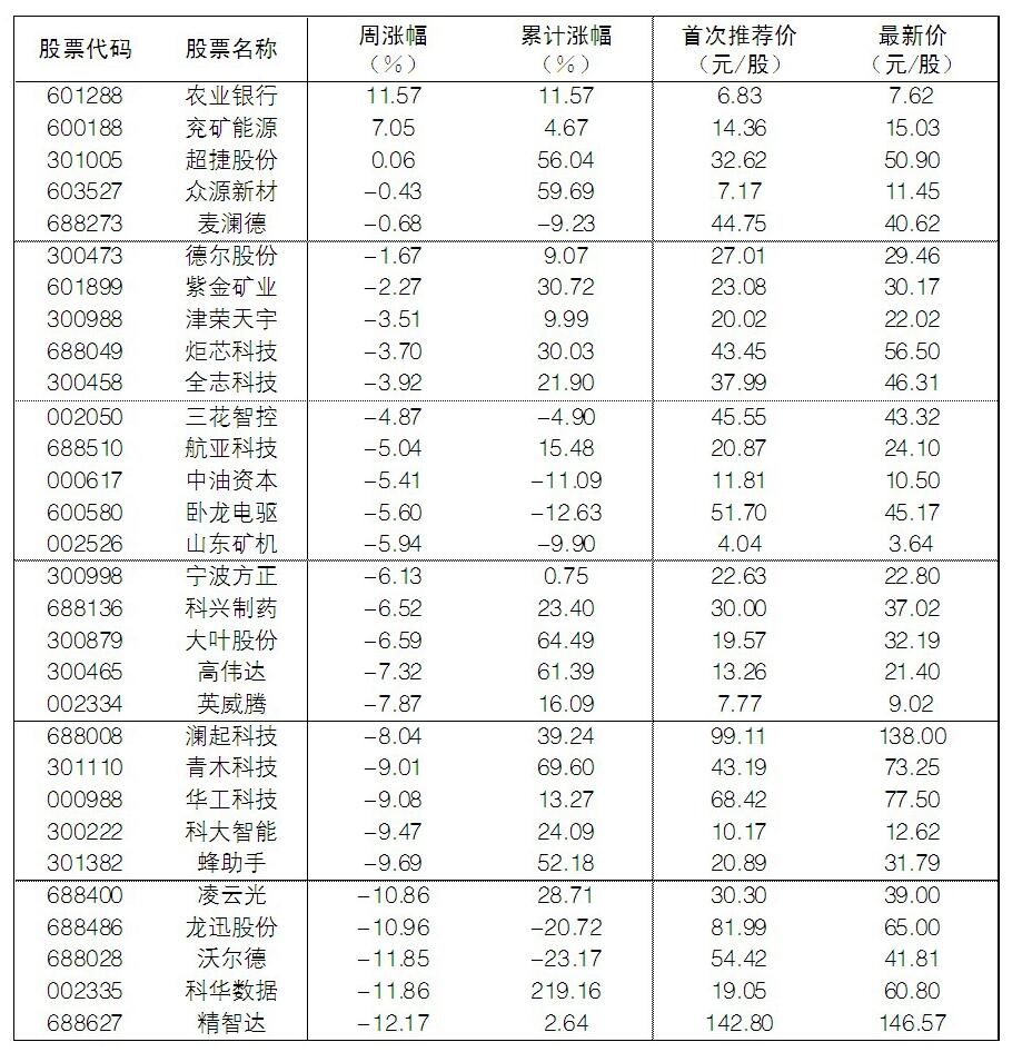 大众30指数成份股中,本周股价逆市上涨的是农业银行、兖矿能源、超捷股份,涨幅分别为11.57%、7.05%、0.06%;跌幅榜上,精智达、科华数据、沃尔德、龙迅股份等跌幅居前。